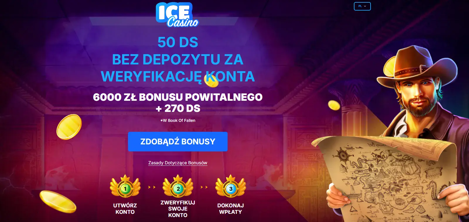 W Ice Casino możesz wybrać jeden z dwóch popularnych bonusów bez depozytu. Po rejestracji otrzymasz 50 darmowych obrotów na automat Book of Fallen (wager x5, czas na obrót: 3 dni). Drugą opcją jest bonus casino 25 euro bez depozytu za samą rejestrację (100 PLN), który objęty jest wyjątkowo niskim wagerem x5 i jest ważny przez 5 dni.